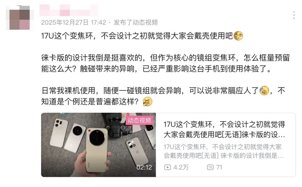 一个小米最不想看到的词条:#小米17 Ultra变焦环松动,出现在社交平台中。