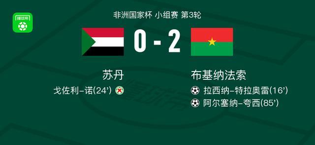 北京时间1月1日,非洲国家杯小组赛第3轮,苏丹迎战布基纳法索。比赛中,斯特凡-阿齐兹-基送出助攻,拉西纳-特拉奥雷破门得分。随后,戈佐利-诺主罚点球未能命中。比赛后段,丹戈-瓦塔拉助攻阿尔塞纳-夸西再入一球。最终,苏丹0-2不敌布基纳法索。