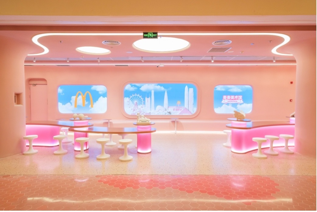 “深圳麦麦美术馆”以“未来主义美学”为灵感,采用大鸟姐姐标志性的柔和粉彩为主调,营造出既梦幻又亲切的整体氛围。汉堡、甜筒、薯条等经典元素化身为趣味雕塑与艺术摆件,构成充满想象力的视觉故事。动态视频墙持续播放流动的数字影像,赋予空间以呼吸感与未来律动,让艺术的感染力触手可及。