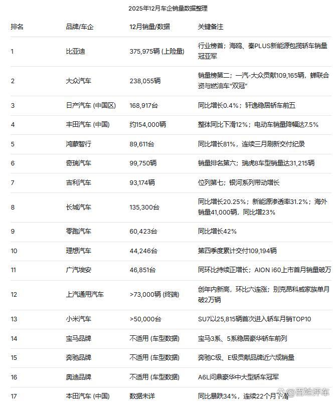 站在2025与2026的交汇点回望,12月的车市收官战意义深远。政策驱动下的销量冲刺,既是对全年目标的最终兑现,也是对市场需求的一次集中释放;而技术革新带来的格局重塑,则预示着行业发展的核心逻辑正在从“政策依赖”转向“产品驱动”。对于车企而言,补贴退坡与政策调整是必然趋势,无论是持续领跑的自主品牌、稳健突围的大众、日产等合资企业,还是快速崛起的新势力品牌,唯有将短期政策红利转化为长期研发投入,在电池技术、智能驾驶、服务体系等方面持续深耕,才能在未来的市场竞争中占据主动。