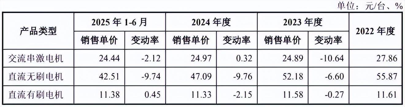 不过,《招股书》显示,晨光电机近年来主要产品的销售单价呈下降趋势。其中,交流串激电机的销售单价从2022年的27.86元/台降至2025年上半年的24.44元/台,直流无刷电机的销售单价则从55.87元/台降至42.51元/台。
