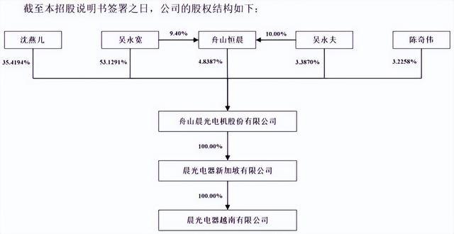 截至目前,吴永宽任晨光电机的董事长兼总经理,直接持股53.13%,并通过员工持股平台舟山恒晨间接控股4.84%,是控股股东;沈燕儿则任公司董事,直接持股35.42%;夫妇二人合计控股93.39%,是公司实控人。