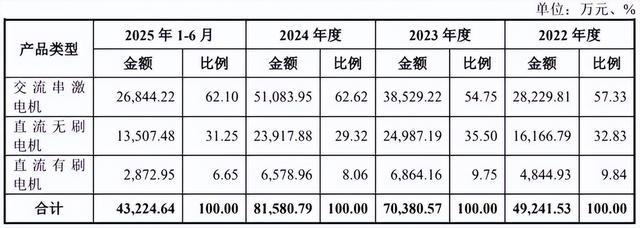 其中,晨光电机的交流串激电机产品主要应用于对功率要求较大、且以交流电源供电的大功率吸尘器、扫地机器人基站和电动工具等产品,2022年—2024年及2025年上半年(下称“各期”),该产品分别实现营收2.82亿元、3.85亿元、5.11亿元和2.68亿元,分别占公司主营业务收入的57.33%、54.75%、62.62%和62.1%,是公司第一大产品。
