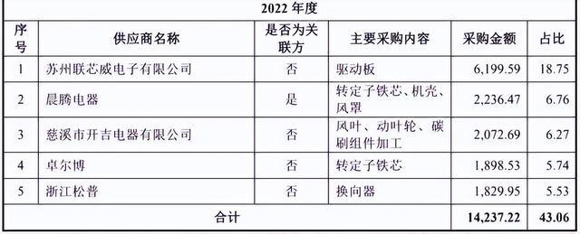 《招股书》显示,2022年,晨光电机全年向晨腾电器采购了2236.47万元的转定子铁芯、机壳和风罩等物品,晨腾电器也是晨光电机该年占采购额6.76%的第二大供应商。