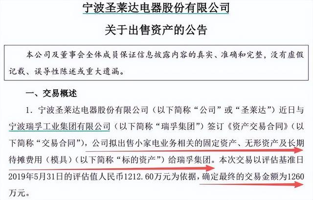 2019年7月,圣莱达(002473.SZ)发布公告称,近年来,由于产能过剩及劳动力成本逐年提高等原因,公司小家电业务连续亏损且呈扩大化趋势,为减少经营性亏损,实现战略转型,公司拟将小家电业务以1260万元的价格出售给瑞孚工业集团。