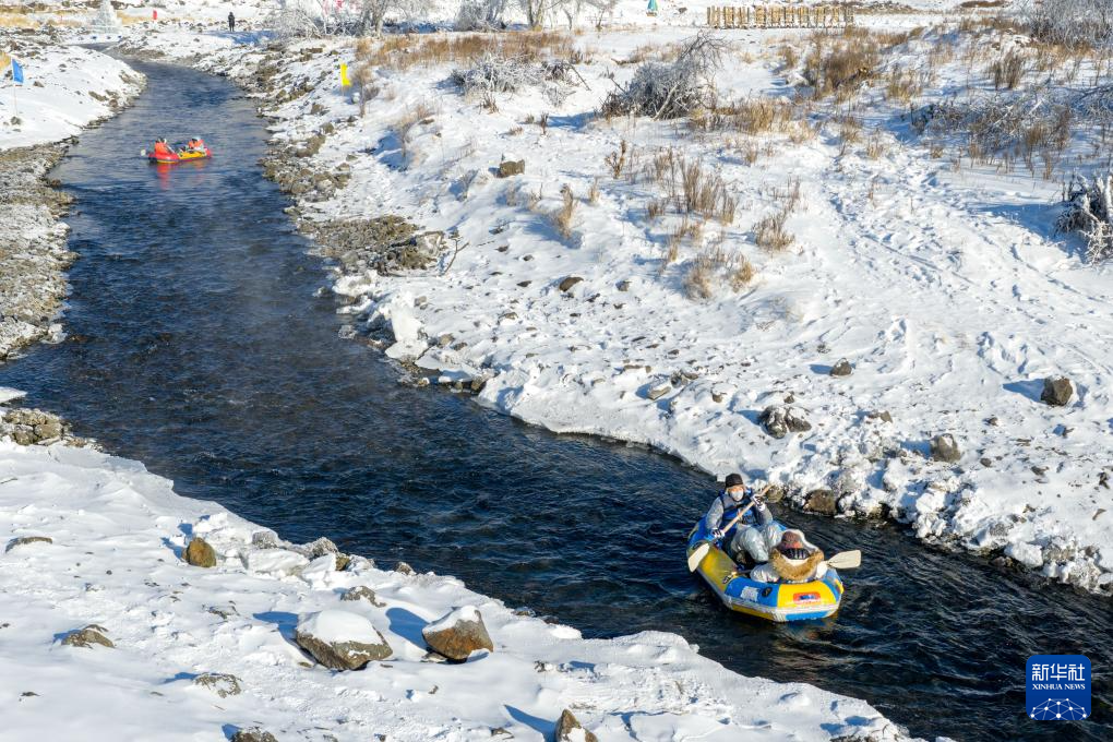 2026年1月1日,在内蒙古兴安盟阿尔山市,游客在哈拉哈河中体验不冻河漂流(无人机照片)。