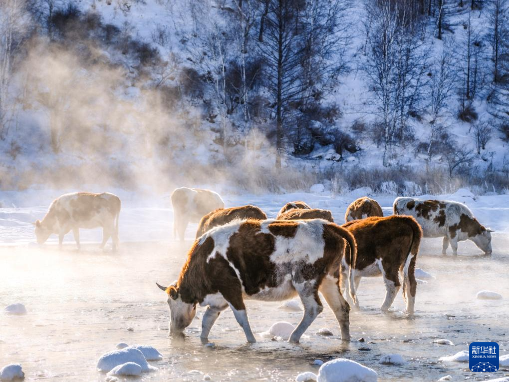 2026年1月1日,在内蒙古兴安盟阿尔山市,牛群在哈拉哈河中饮水。