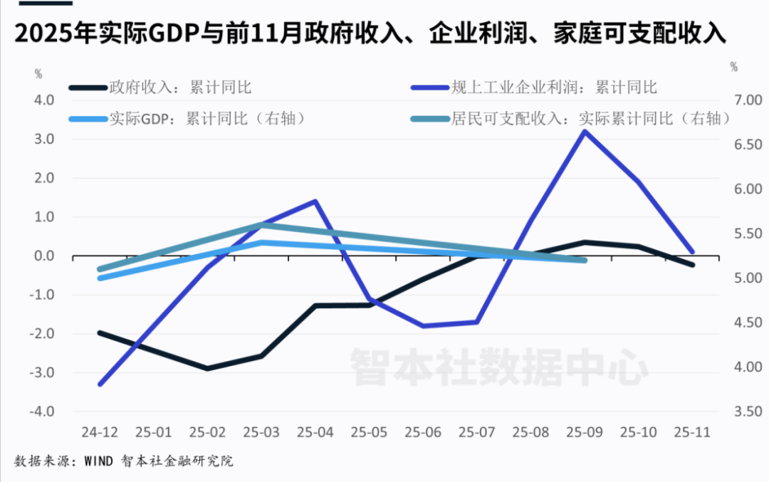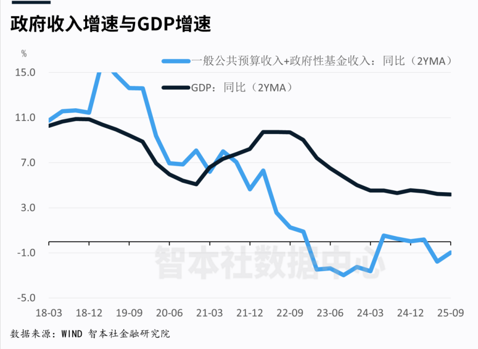 从2018年一季度到2021年三季度,政府收入(全国一般公共预算收入+全国政府性基金预算收入)跑赢实际GDP增速,平均增速高1.98个百分点;从2021年四季度至2025年三季度,政府收入大幅跑输实际GDP增速,平均增速低6.29个百分点。预计2025年还将延续这一趋势,政府收入增速低于实际GDP增速超6个百分点。