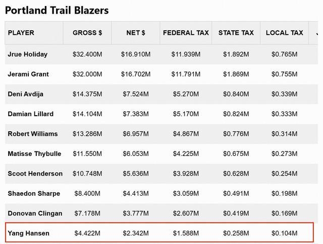 2025-26赛季为杨瀚森的新秀赛季,本赛季合同薪资为442.236万美元,据统计,杨瀚森需要交158.8万的美国联邦政府税、25.8万的州税、10.4万的地方政府税、1.7万的运动员税及个人养老保险扣除等,最终到手工资约为234.2万美元。