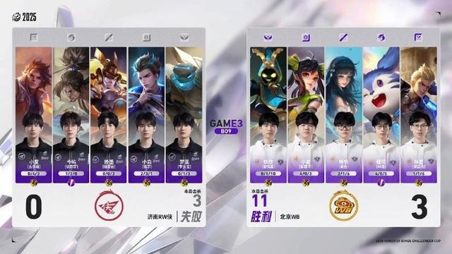 北京时间1月2日,2025王者荣耀挑战者杯决赛。北京WB迎战济南RW侠,济南RW侠自2019年后再进决赛。上半场比赛结束,北京WB暂时4-0领先济南RW侠。