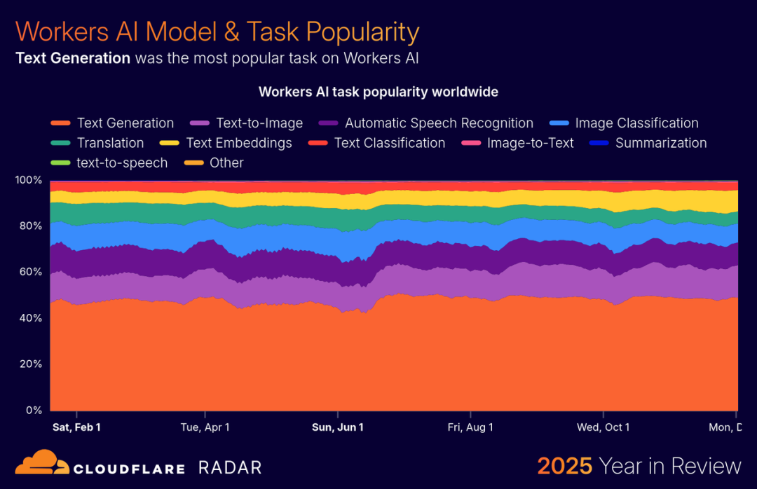 开发者能就近跑模型,按用量付费,不用自己买卡、搭环境。在 Workers AI 上,Meta 的 llama-3-8b-instruct 模型最受欢迎,文字生成则是最常用的任务类型。