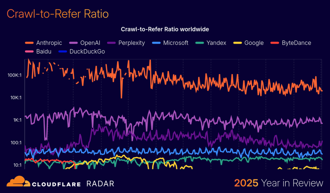 最新的结果显示,Anthropic 的爬行推荐比率一度飙到 500000:1——就是爬你 50 万次,才给你带来 1 个访客。后来虽然稳定在 25000:1 到 100000:1 之间,但本质还是白嫖。