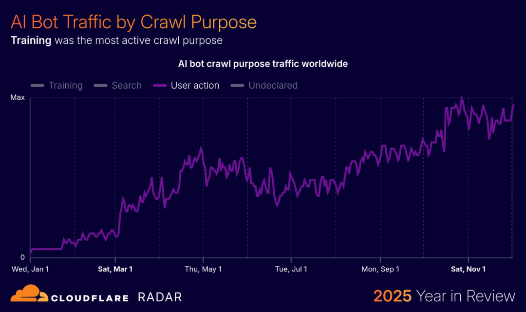作为守护全球众多网站的金牌保镖,Cloudflare 对爬虫攻击的监测最有发言权。今年 Cloudflare 在分析 AI 爬虫的活跃度后发现,2025 年,用户行为类的 AI 爬取量增长了超过 15 倍。