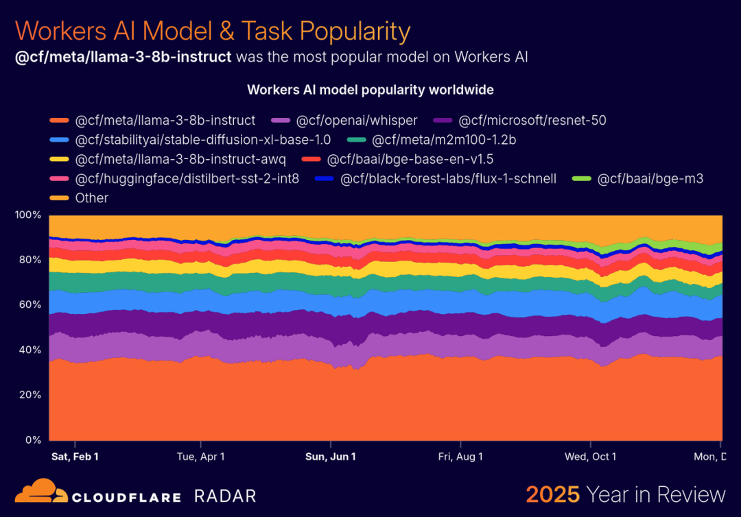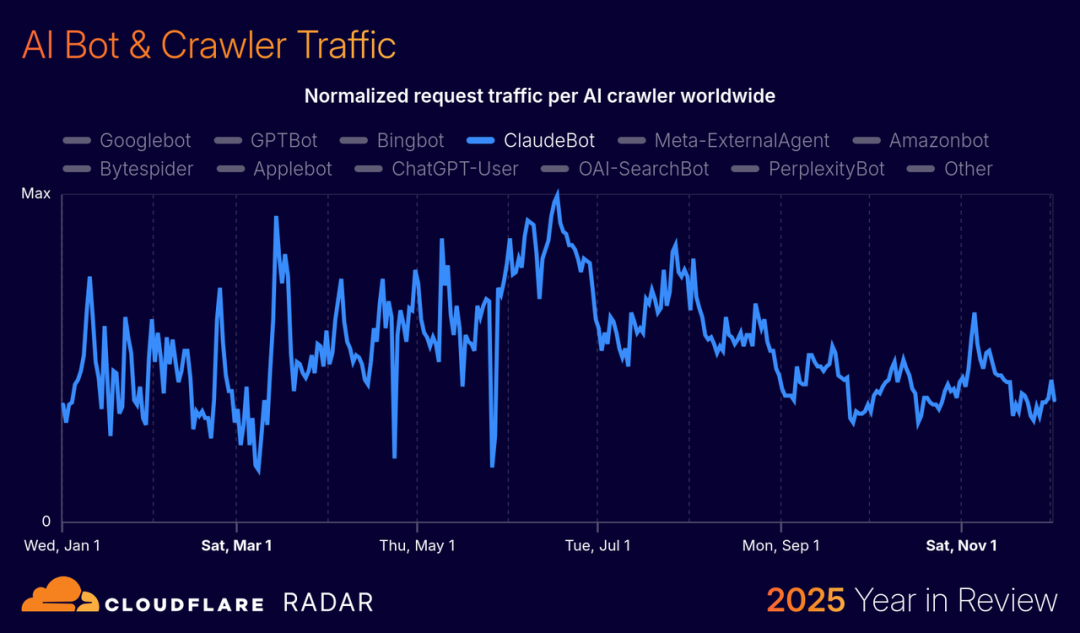 网站安全公司 Cloudflare 最近发布了 2025 年度回顾报告,从底层基础设施的视角,给我们呈现了一个另类的 AI 生存图鉴。