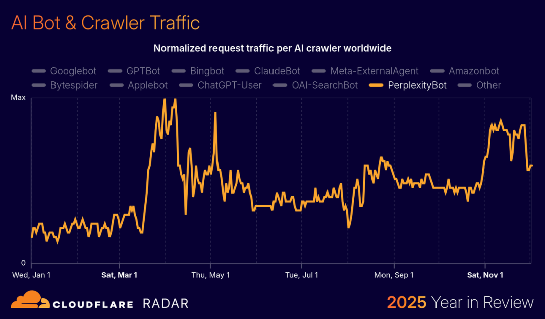 爬虫界的「三巨头」格局也基本定了:Googlebot 稳坐第一,OpenAI 的 GPTBot 排第二,占比约 7.5% 但波动极大;Microsoft 的 Bingbot 相对稳定,贡献了 6% 的流量。
