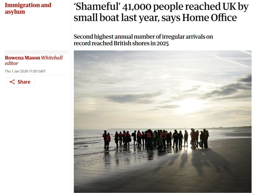 当地时间2026年1月1日,英国内政部公布的数据显示,2025年共有41472名移民乘坐小船横渡英吉利海峡进入英国,为有记录以来年度第二高水平。