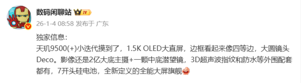 1月4日,根据博主“数码闲聊站”的爆料,有一款被手机厂商内部定义为“全能大屏旗舰”的新机,其处理器规格可能为:天玑9500系列的小迭代芯片(命名或为天玑9500+)。从该博主的评论区来看,这款新机极大可能为vivo X300s。