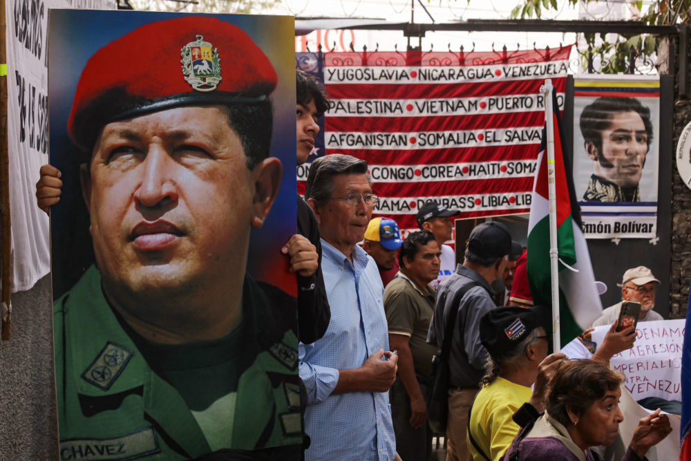 1月3日,支持马杜罗总统的民众在委内瑞拉首都加拉加斯总统府附近举行抗议活动。