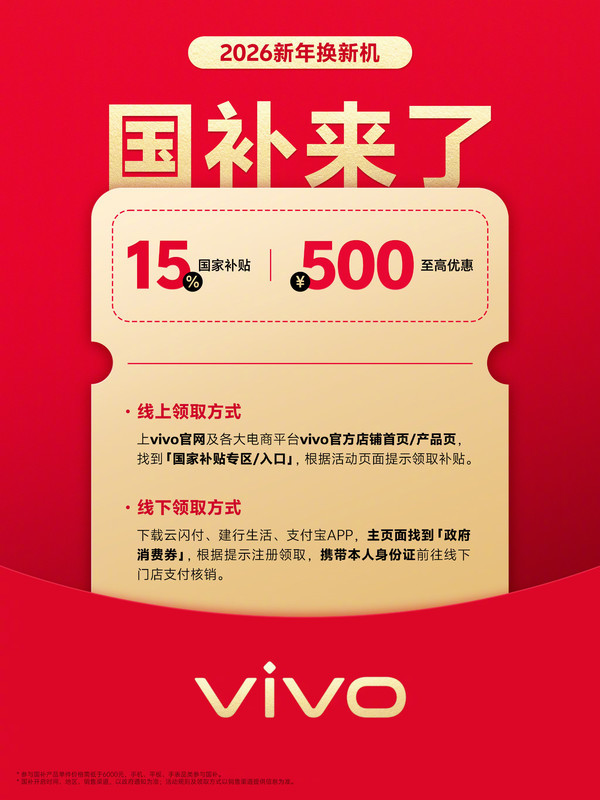 此前,vivo官方已宣布全面参与2026年国家以旧换新及消费补贴政策。根据公告,消费者购买指定vivo国补机型可享受15%的国家补贴,单台至高优惠500元。活动覆盖线上线下渠道:线上可通过vivo官网及各大电商平台vivo官方店铺首页或产品页进入“国家补贴专区”按提示领取;线下则需通过云闪付、建行生活或支付宝APP,在主页面查找“政府消费券”入口完成注册,并携带本人身份证前往vivo授权门店核销使用。