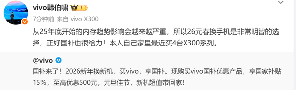 2026年1月4日,vivo通信科技有限公司产品经理韩伯啸在社交平台发文指出,自2025年底开始的内存芯片涨价趋势影响将日益加剧,因此在2026年元春期间更换手机是“非常明智的选择”,并提到当前国家补贴政策力度较大,有助于消费者降低购机成本。