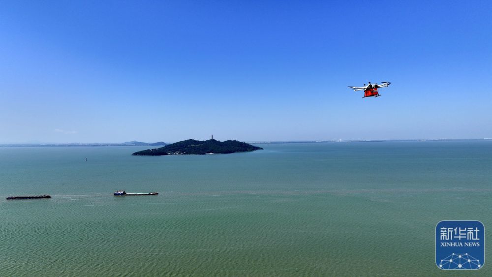 ↑2025年8月19日,在安徽省合肥市巢湖上空,无人机在配送快递包裹(无人机照片)。新华社记者 黄博涵 摄