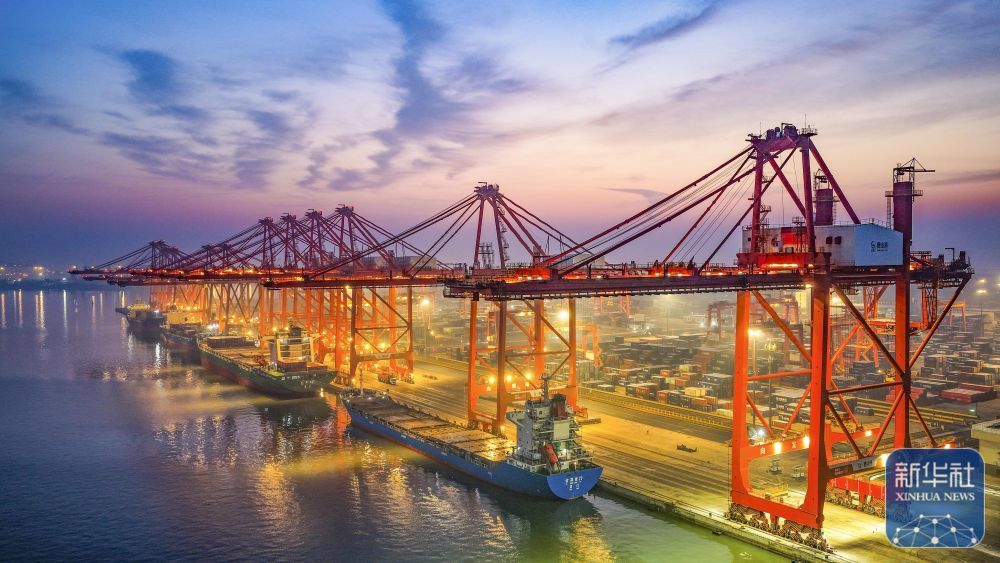 ↑2025年12月15日,轮船停泊在河北省唐山港京唐港区集装箱码头进行装卸作业(无人机照片)。新华社发(刘满仓 摄)