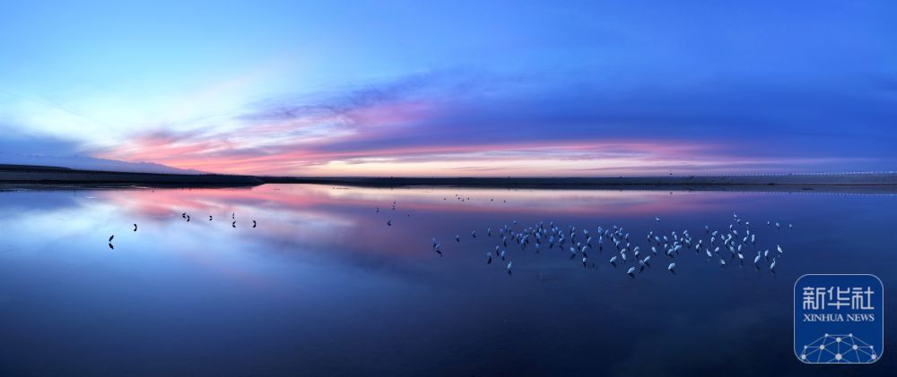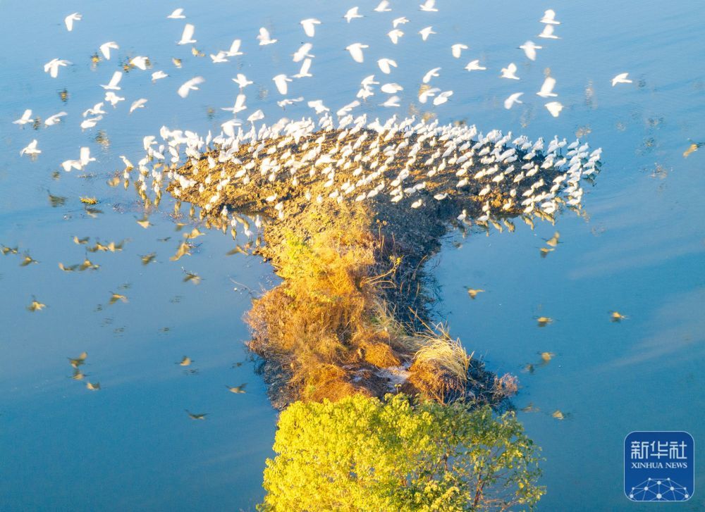 ↑2025年11月9日,在甘肃省酒泉市阿克塞哈萨克族自治县,白鹭在冬不拉水库栖息觅食(无人机照片)。新华社发(高宏善 摄)
