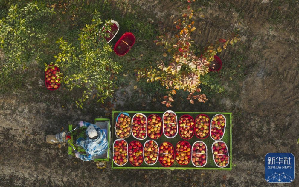 ↑2025年10月23日,在新疆生产建设兵团第一师阿拉尔市六团三连苹果园,林果业服务队队员运输刚采摘的苹果(无人机照片)。新华社记者 才扬 摄