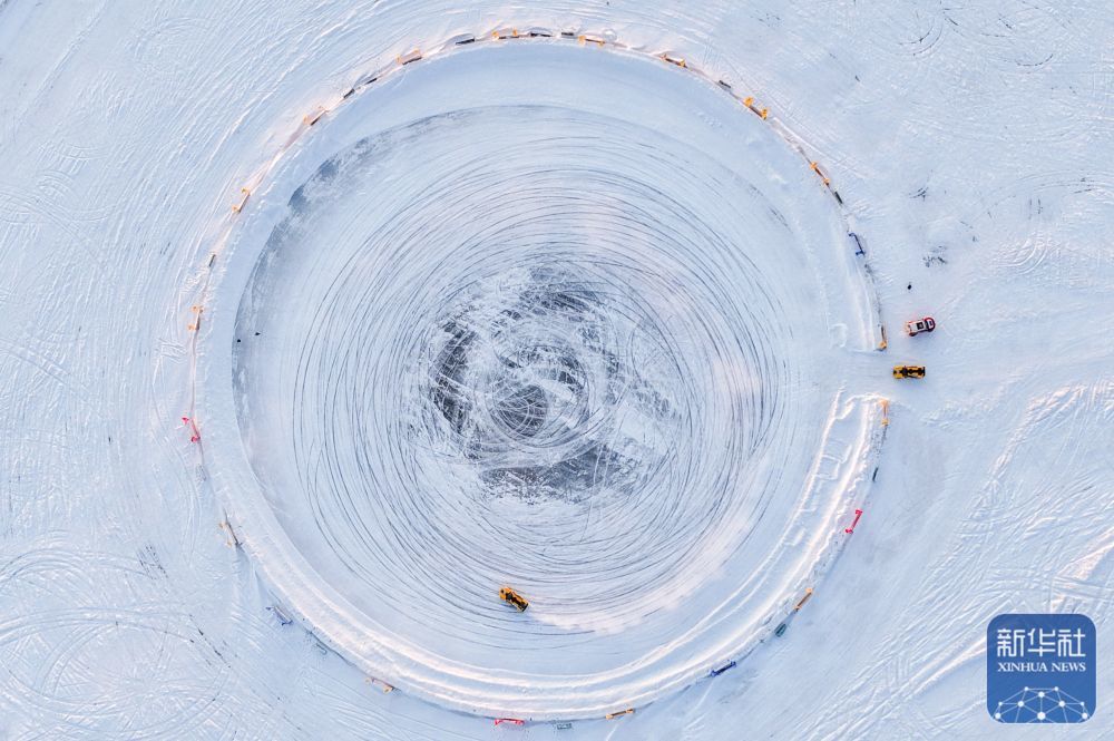 ↑2025年12月21日,车手驾驶赛车在内蒙古呼伦贝尔市苍狼白鹿冰雪运动基地冰面上漂移(无人机照片)。新华社记者 连振 摄
