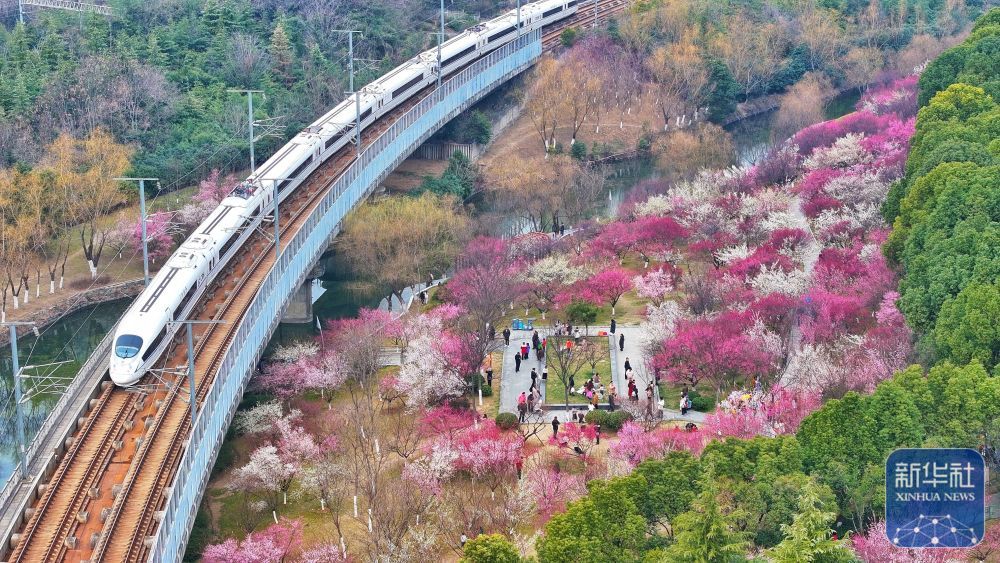 ↑2025年2月22日,安徽省合肥市蜀山区匡河公园梅花绽放,列车从一旁驶过(无人机照片)。新华社发(陈三虎 摄)