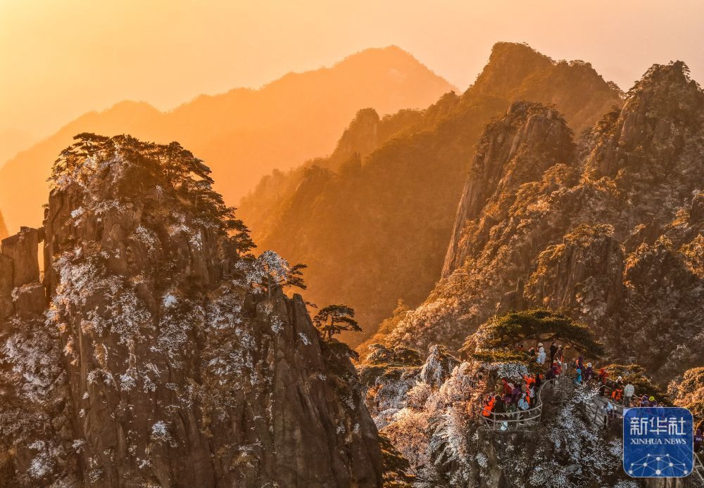 ↑2025年12月14日,游客在安徽省黄山风景区欣赏雪后日出美景(无人机照片)。新华社发(施亚磊 摄)