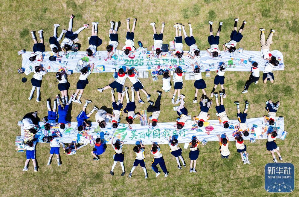 ↑2025年6月4日,江苏省兴化市施耐庵小学学生在“美丽中国我先行”环保主题活动中绘画(无人机照片)。新华社发(周社根 摄)