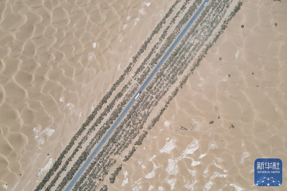 ↑这是2025年7月18日拍摄的新疆塔里木沙漠公路。塔里木沙漠公路1995年贯通,全长522公里,南北贯穿有“死亡之海”之称的中国最大沙漠——塔克拉玛干沙漠。公路建成30年来,探索出的生态防护林、光伏与零碳技术、沙生植物筛选等沙漠化防治技术体系为塔克拉玛干沙漠锁边工程的实施提供了重要技术支撑。新华社记者 孟涛 摄