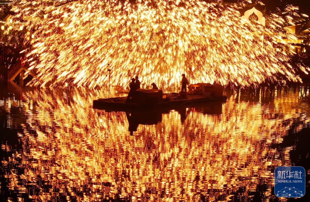 ↑2025年1月29日,在湖南省衡阳市南岳区“南岳里”庙会民俗美食街区,民间艺人在为游客表演非遗打铁花(无人机照片)。新华社发(曹正平 摄)