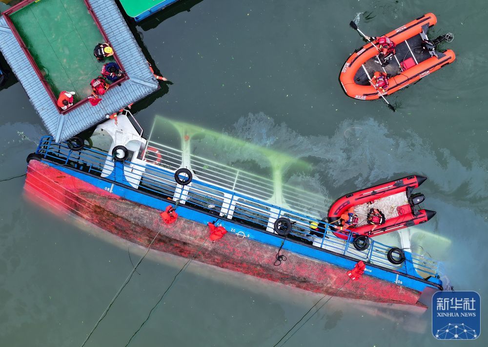 ↑2025年5月5日,救援人员在贵州毕节黔西市新仁乡乌江百里画廊景区对倾覆船只进行搜救(无人机照片)。新华社记者 刘续 摄
