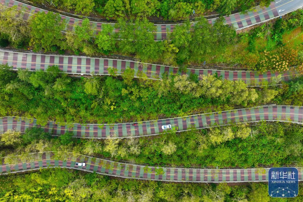 ↑2025年10月24日,汽车行驶在重庆市黔江区石家镇关口村银杏树、栾树等彩叶树掩映的公路上(无人机照片)。新华社发(杨敏 摄)