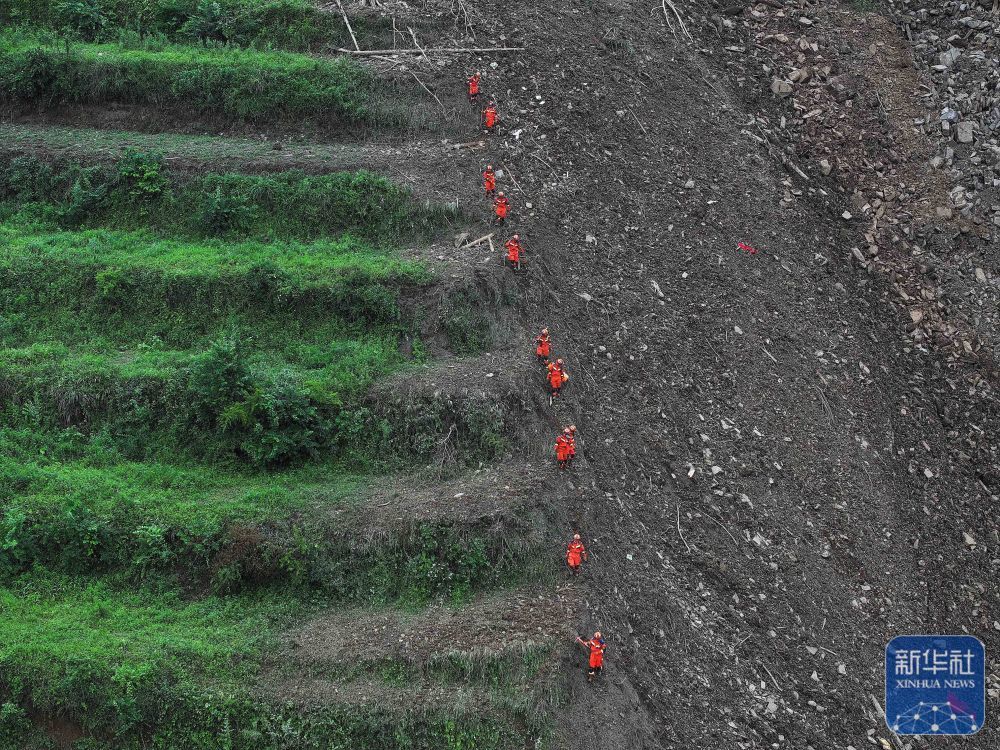 ↑2025年5月22日,救援人员在贵州省大方县果瓦乡庆阳村山体滑坡现场进行搜救(无人机照片)。新华社记者 杨文斌 摄