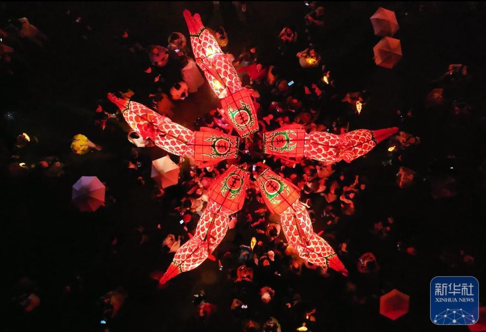↑2025年11月9日,鱼灯表演队伍在安徽省黄山市徽州区呈坎古村巡游(无人机照片)。新华社记者 曹力 摄