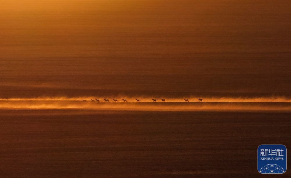↑2025年12月9日,在新疆阿尔金山国家级自然保护区,藏野驴奔跑在日出时的依协克帕提草原上(无人机照片)。新华社记者 辛悦卫 摄