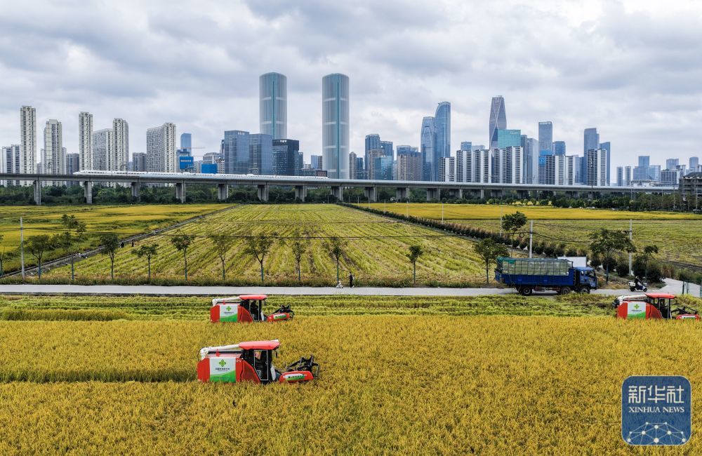 ↑2025年10月21日,位于浙江杭州萧山区世纪田园粮食功能区的稻田里,收割机在收割水稻,远处高铁列车飞驰而过(无人机照片)。新华社记者 徐昱 摄