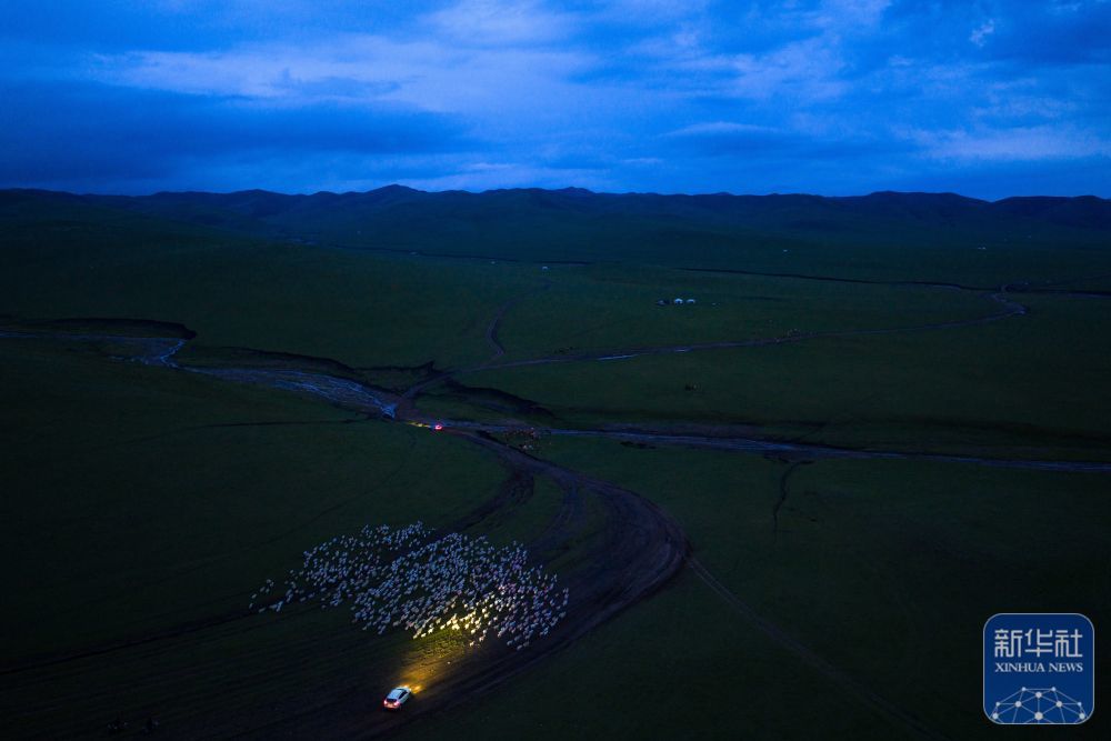 ↑2025年6月14日,牧民在内蒙古赤峰市阿鲁科尔沁草原上驱赶羊群赶夜路(无人机照片)。新华社记者 马金瑞 摄
