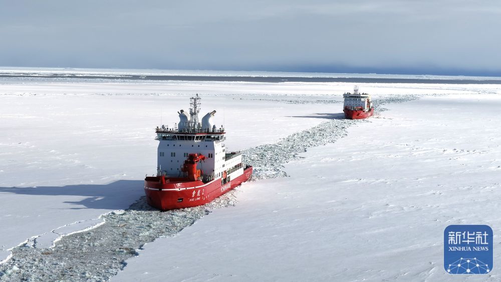 ↑2025年12月5日,执行中国第42次南极考察任务的“雪龙2”号(前)在为“雪龙”号破冰引航(无人机照片)。新华社发(陈栋彬摄)