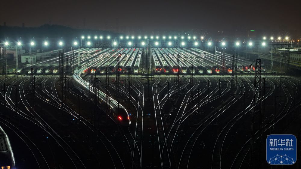 ↑2025年1月14日凌晨,多辆动车组列车停放在湖南长沙动车运用所整装待发(无人机照片)。1月14日,2025年春运开启。新华社记者 陈振海 摄