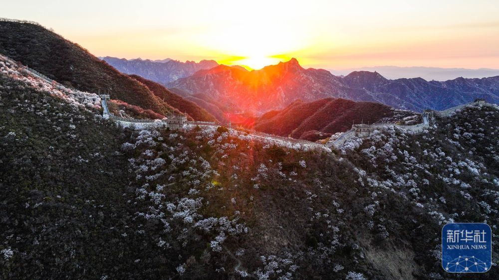 ↑这是2025年4月5日太阳初升时拍摄的慕田峪长城(无人机照片)。新华社记者 陈晔华 摄