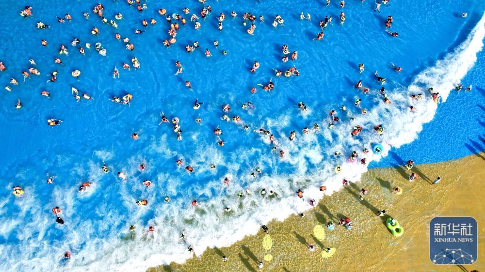 ↑2025年7月5日,浙江省湖州市长兴县太湖图影旅游度假区龙之梦乐园嬉水世界,游客亲水消暑(无人机照片)。新华社发(吴拯 摄)