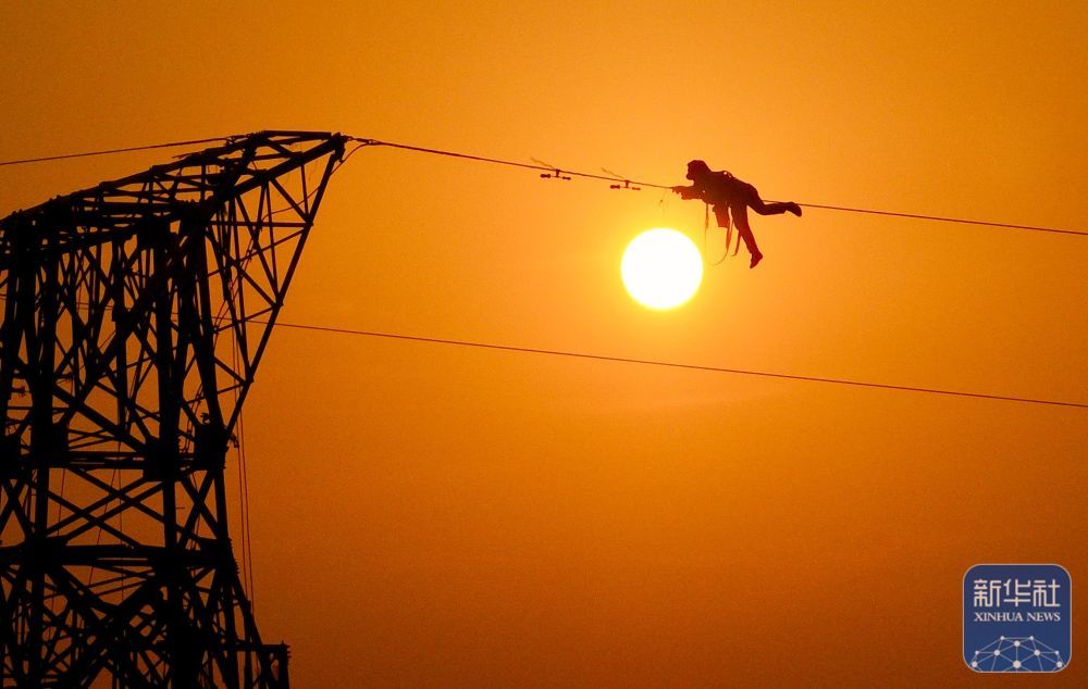 ↑2025年12月16日,施工人员在安徽香涧至鹭岛500千伏线路工程施工现场进行高空作业(无人机照片)。新华社记者 周牧 摄