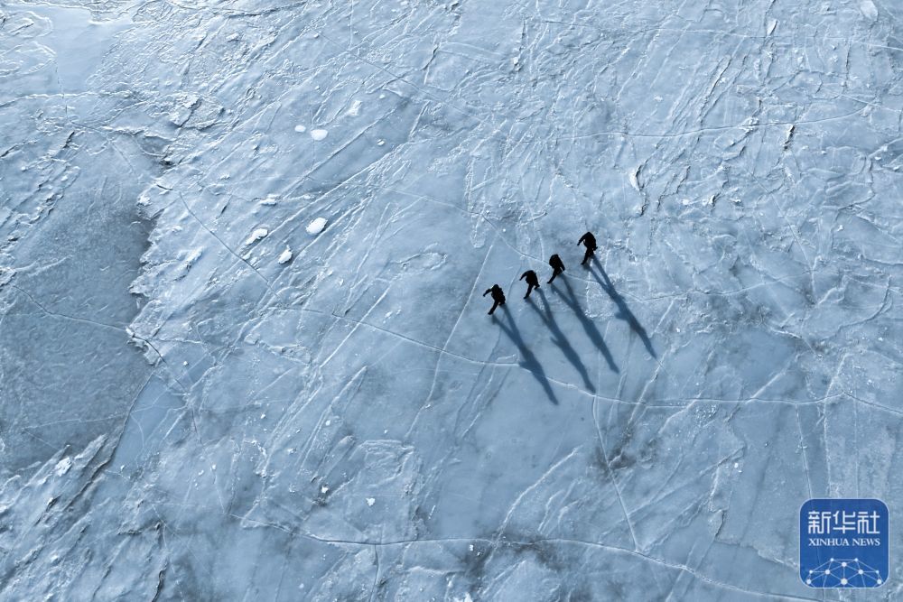↑2025年1月9日,青海省海北藏族自治州刚察县青海湖派出所民警在巡护青海湖(无人机照片)。新华社记者 张龙 摄