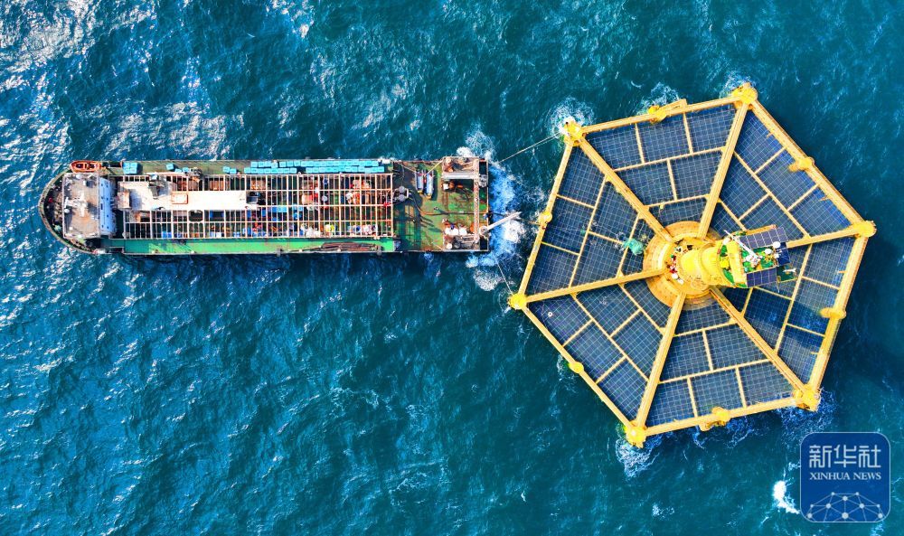 ↑ 2025年1月12日,中国自主研制的大型深海智能渔业养殖装备“深蓝2号”与养殖工船(左)在进行联合收鱼作业(无人机照片)。新华社记者 李紫恒 摄