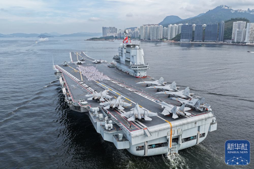 ↑2025年7月3日,中国海军山东舰航母编队抵达香港(无人机照片)。新华社发(蒲海洋 摄)