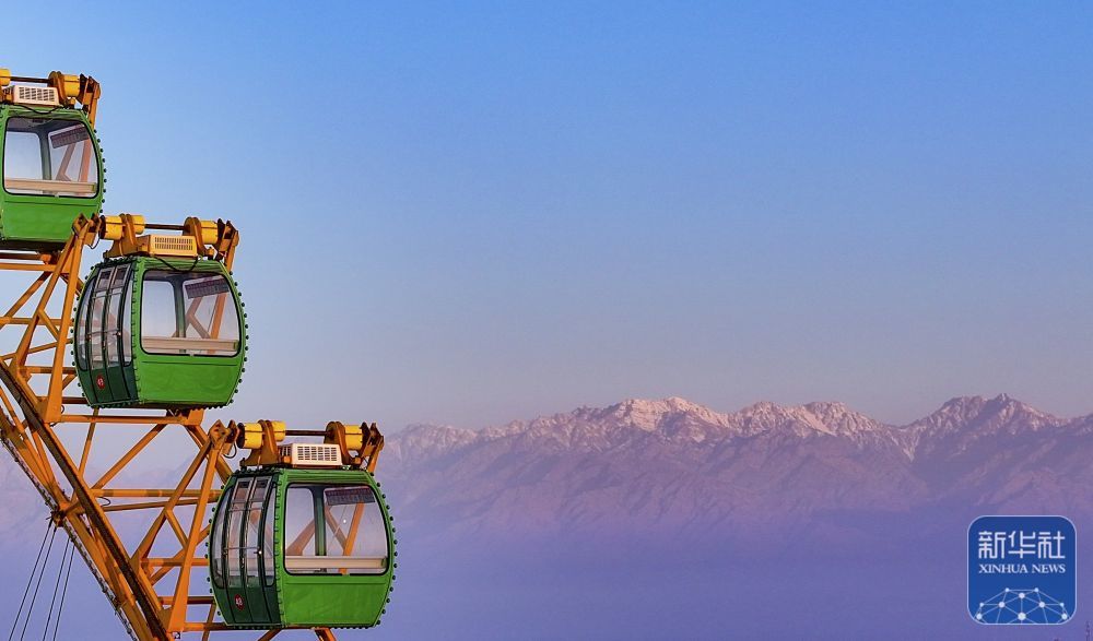 ↑2025年2月9日在宁夏银川阅海欢乐岛游乐场拍摄的贺兰晴雪景观(无人机照片)。新华社记者 冯开华 摄